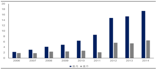 2006年-2014年光迅科技海内外市场营业收入(单位:亿元)
