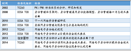 全国信息安全标准化技术委员会(简称信息安全标委会,TC260)于2002年7月专门成立了PKI/PMI(WG4)工作组,进行国内外PKI/PMI标准体系的分析、研究PKI/PMI标准体系、国内急用标准调研并完成一批PKI/PMI基础性标准的制定。2007年中国通信标准化协会(CCSA)的网络与交换工作委员会(TC3)的网络总体工作组(WG1)设立了“下一代网络中身份管理(IDM)技术研究”。2008年中国通信标准化协会的网络与信息安全工作委员会(TC8)着手设立了“身份管理(IDM)相关技术研究”项目,所属安全基础工作组(WG4)启动了“身份管理体系架构”、“身份管理通用身份数据模型”、“身份管理接口消息技术要求”、“身份管理互通技术要求”、“移动网络中的身份管理架构需求”等标准的研究。