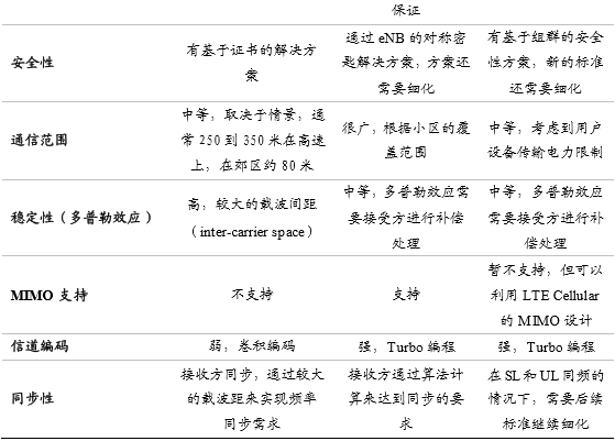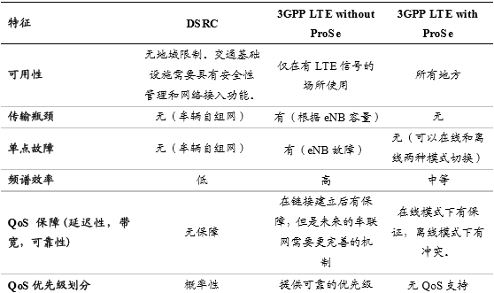 在可用性方面,DSRC具有不依赖于网络基础设施(比如安全性管理和互联网接入等功能)和自组网的良好特性,所以基于DSRC标准的V2X网络稳定性强,不会由于传输瓶颈和单点故障的原因导致整个系统无法工作。而在不包含ProSe功能的LTE版本中,LTE-V需要依赖基础网络设施,在R12以后的版本中,由于LTE加入了ProSe功能后,LTE-V功能支持在线和离线两种模式,互联网连接不在是必备选项了。另一方面由于DSRC使用的是不经过协调的信道接入策略,这种策略无法满足