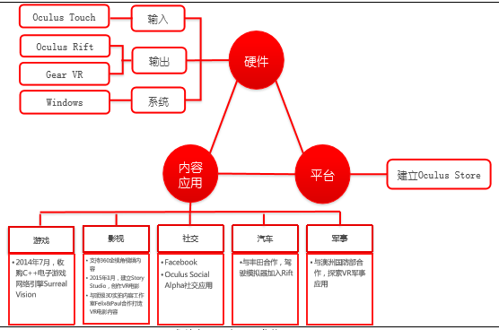 硬件方面:Oculus已推出自己开发的PCVR——OculusRift,预计不久将发布其头显的配套交互设备OculusTouch;此外,Oculus还与三星合作共同开了专用型移动VR——GearVR,形成了PCVR与移动VR的双重布局。