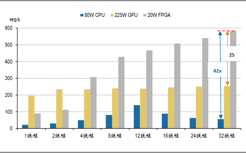 CPU、GPU、FPGA不同线程下处理速度对比图