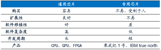 专用芯片以智能算法和仿生两条主线并行。专用芯片又称为“人工智能芯片”“神经网络芯片”等,目前专用芯片有两种思路:以智能算法为主线和以仿生为主线,两者的典型代表分别为寒武纪、IBMTureNorth。寒武纪1号的主频可以达到0.98GHz,处理速度相当于同等面积下CPU的100倍。即便与最先进的GPU相比,寒武纪1号的人工神经网络处理速度也不落下风,而其面积和功耗远低于GPU的1/100。IBM在复杂性和使用性方面取得了突破。4096个内核,100万个“神经元”、2.56亿个“突触”集成在直径只有几厘米的方寸之间,能耗不到70毫瓦。