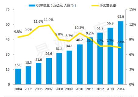 2014年,中国GDP总量达到63.6万亿元人民币,折合美元首次超过10万亿美元,规模上达到重要里程碑,主要经济指标处于合理区间,GDP同比增长7.4%,城镇新增就业超过1300万人,实现了年初的预期目标。中国2014年GDP同比增长7.4%,跟过去的高速增长相比,增速略有放缓,从世界范围看,7.4%的增速在全球主要经济体中仍然是高的。