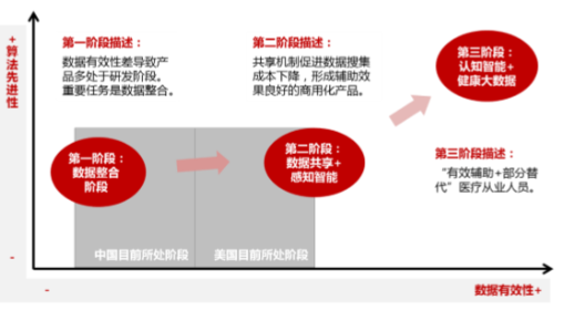 按照算法先进性和数据有效性,“人工智能+医疗”应用分为三个阶段: