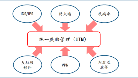 UTM本质是多种安全功能的集成。目前的网络攻击呈现混合化趋势,单一的防火墙、入侵检测&防御系统以及抗病毒软件无法应对此类攻击,因此需要一种集多种防御功能于一身的综合防护产品,统一威胁管理应运而生,该词最初由IDC创造,将其定义成由硬件、软件和网络技术组成的能够提供一项或多项安全功能的集成设备,能够全面覆盖2~7层中的各种攻击,抵御各种威胁,具有成本优势且易于管理。