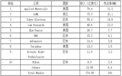 根据SEMI的统计,2014年全球半导体设备市场规模为375亿美元,而前十大半导体设备厂商的销售额为351亿美元,市场占有率高达93.6%,行业处于寡头垄断局面。其中美国的应用材料公司(AMAT)以79.4亿美元的销售额位居全球第一,全球设备市场市占率21.2%。