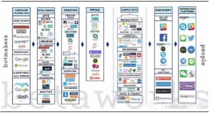 Bots行业从上游到下游,产业链依次为语音/文本处理—人工智能—产品开发—渠道—产品聚合(Bots应用商店)—产品分发应用。
