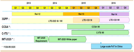 2014年9月,LG率先向3GPP提交了LTE在V2X通信应用的规范草案。同年12月,爱立信提交了增强LTED2D相近服务的规范草案,随后于2015年2月和6月,3GPP的SA1和RAN1工作组分别设立了相关专题,标志着LTE-V技术标准化研究的正式启动。