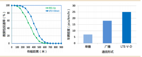 LTE-V性能对比:通信可靠性(左图)与终端容量
