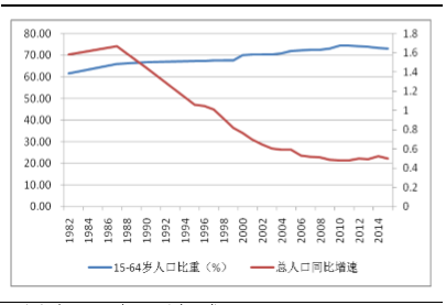 老龄化程度加深,劳动力资源不断减少。在改革开放的前20年里,劳动力资源的充足,为中国经济增长带来了客观的“人口红利”,进入21世纪,随着人口结构不断变化,“人口红利”不断消失。2000年,我国65岁以上老人数为8821万人,占比接近7%,标志着我国正式进入老龄化社会,预计到2025年,中国65岁以上老年人比例将达到1/4,养老问题是中国21世纪最重要的话题之一。与此同时,人口增速也呈现下降趋势,80、90年代年均人口增速在1%以上,目前仅为0.5%;此外,据新浪网报道,2012年,中国15-59岁比上一年减少345万,占总人口比重的69.2%,比上年末下降0.6%,系中国劳动年龄人口数量的首次下降,2013-2015年,劳动年龄人口持续下降,截至2015年末,为91096万人,从这个角度讲,刘易斯拐点已经到来。