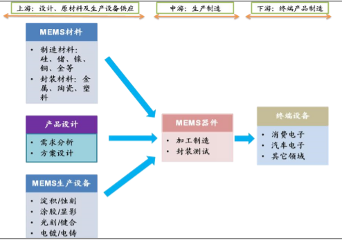 MEMS产业链的上游负责MEMS器件设计、材料和生产设备供应,中游生产制造出MEMS器件,下游使用MEMS器件来制造终端电子产品。
