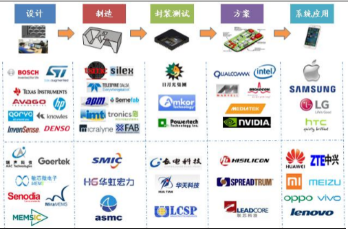 MEMS整个产业链复杂,涉及的厂商众多;中国的设计、制造、封装测试厂商都在积极布局MEMS,已形成完整MEMS的产业链。