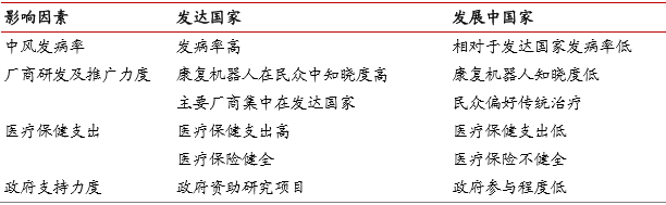 产品知晓度、政府支持力度、医疗保健支出及中风发病率等因素是康复机器人市场在发达国家和发展中国家的市场规模及增速不同的主要原因。