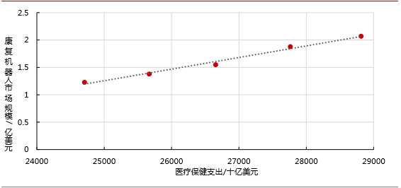 3、医疗保健支出与康复机器人市场规模是线性相关的