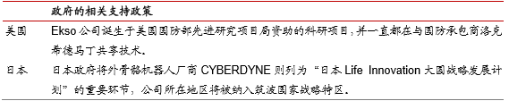 发达国家在康复机器人领域引领整个产业的研发方向,近年来众多外骨骼机器人厂商涌现,这与发达国家对于该产业的引导与扶持是密不可分的。以美国与日本为例,美国的外骨骼机器人厂商EKSO从公司创立到产品的研发推广都得到了美国军方与国防部的大力支持,日本方面,外骨骼机器人厂商CYBERDYNE则列为“日本LifeInnovation大国战略发展计划”的重要环节,所在地区将被纳入筑波国家战略特区。