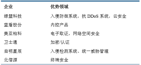 几大安全厂商凭借优势产品,在国内市场占据一席之地。经过二十多年的发展,我国网络安全市场呈现百家争鸣的现状,超过50家大大小小的企业在网络安全不同细分赛道中竞争,逐渐产生了很多细分领域的龙头企业,引领行业的方向,拉动整个细分市场不断扩大。其中一些安全厂商由于进入行业较早,长期积累了技术优势,客户优势等,在市场份额较大的细分领域拥有较高占有率。
