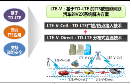 LTE-V是一种新型车载短距离通信网络,针对车辆应用定义了两种通信方式:蜂窝链路式(LTE-V-Cell)和短程直通链路式(LTE-V-Direct)。蜂窝式承载传统的车联网业务,直通式引入LTED2D(Device-to-Device),实现V2V、V2I直接通信,促进实现车辆安全驾驶。