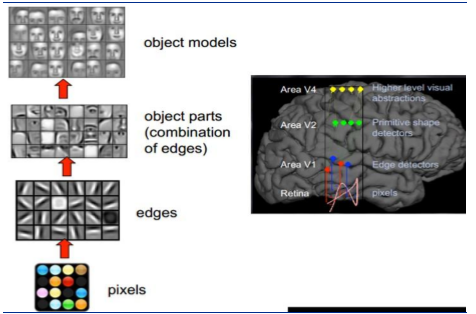 人类视觉从原始信号摄入开始(瞳孔摄入像素),接着做初步处理(大脑皮层某些细胞发现边缘和方向),然后抽象(大脑判定,眼前的物体的形状),然后进一步抽象(大脑进一步判定该物体是人脸)