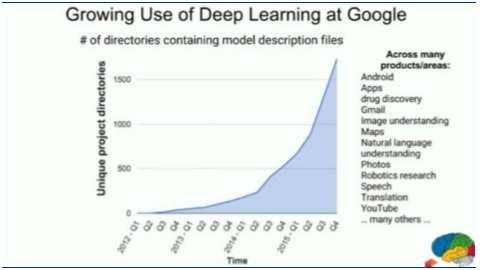 深度学习在谷歌各项业务中迅速应用效果惊人。调查报告在谷歌内部,深度学习从少数的产品组应用起步,一开始就取得了非常大的突破(首次应用到语音识别错误率就降低了30%),更多的团队开始采纳深度学习算法,目前谷歌内部使用深度学习的产品有:安卓、Apps、药品发现、Gmail、图片理解、地图、自然语言、图片、机器人、语音翻译等。全球著名的谷歌大脑其实质上就是一个大规模的人工神经网络,它实现了对谷歌各项业务的智力支撑。