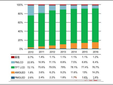 AMOLED市场份额将逐年增加。根据市调公司NPDDisplaySearch公司的报告,调查报告2013年AMOLED拥有中小型显示面板市场出货份额的9.2%,并将于2016年达到14.2%,同期TFTLCD的份额则将从79%下降到76.7%。