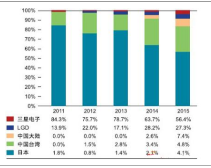 韩国企业在AMOLED市场占据绝对优势。据市场调查机构DIGITIMESResearch报告,研究报告2015年全球AMOLED面板产达1147万平方米,较2012年增加327%,主要牵动供给面成长的动力仍是韩国厂商,着重的应用为智能手机以及电视应用。韩国厂商在AMOLED产能的全球占有率,2012年为97.7%,预估2015年韩国厂商仍可维持83.7%的高比重,主要原因是三星及LG显示器均持续地扩大其AMOLED面板产能,包括扩大既有的5.5代OLED生产线产能,并可能新增6代、8代生产线产能。