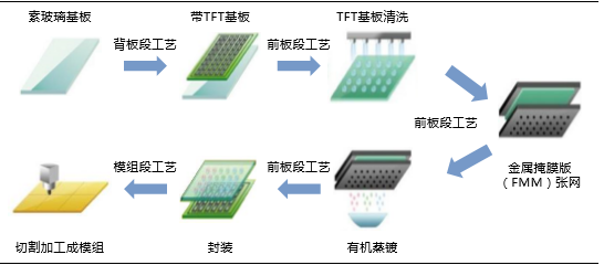 OLED面板制作过程大致可以分为背板段、前板段以及模组段三道工艺。其中前板段的高精度金属掩膜板蒸馏工艺(FMM)是整个工艺环节的核心,也是OLED发光器件的制备过程。