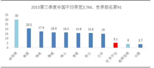 据CDN服务商Akamai的最新数据,研究报告2015年第三季度全球的平均网速为5.1M,全球享受25M以上网速的人还不到总人口的5%。中国内地平均网速只有3.7M,排在全球的第91位。