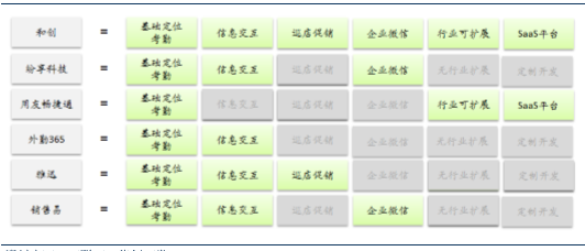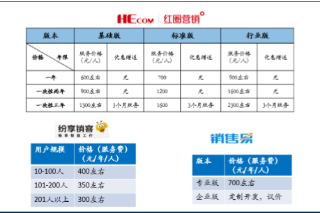 (2)产品线:和创拥有深度定制款产品。分析报告纷享销客是“一款产品打天下”,初期推广较快,但长期看随着微信、钉钉等介入轻型CRM产品,纷享销客产品将面临重大威胁。销售易重点做大企业版定制产品,尚无针对行业的深度定制产品,针对中小企业的产品覆盖有限。红圈“1+N”产品体系既有针对中小企业的通用版、行业版,又有针对大客户的定制版,全面、深度覆盖各类型客户需求。