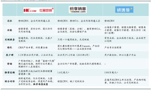 纷享销客、销售易是公司最主要的竞争对手,三者中和创领先优势最明显。和创、纷享科技、销售易是纯粹的成长型的移动CRM服务提供商,移动CRM份额较多,产品、客户、销售推广与和创的可比性较强,和创在移动CRM领域的市场占有率排名第一,领先行业第二名五到七倍,已经具备初步的领先优势。我们下面对这三家公司做详细比较: