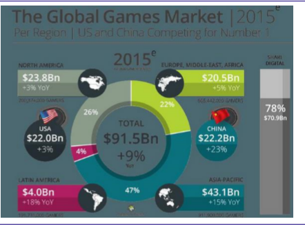 而2015年中国游戏市场规模达到222亿美元,超越美国的220亿美元,跃升全球第一大市场,预计到2018年中国游戏市场总值将达到328亿美元。