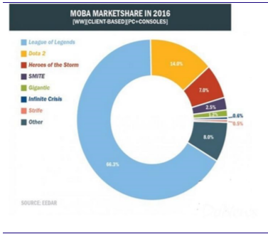 分析报告预计2016年《英雄联盟》将占有2/3的MOBA游戏市场,已成为全球最受欢迎的游戏。在Riot公布的PC游戏人数排名中,截止到2014年初,《英雄联盟》月活跃人数激增至6700万,日活跃人数增值2700万,而最高同时在线人数则增至750万。
