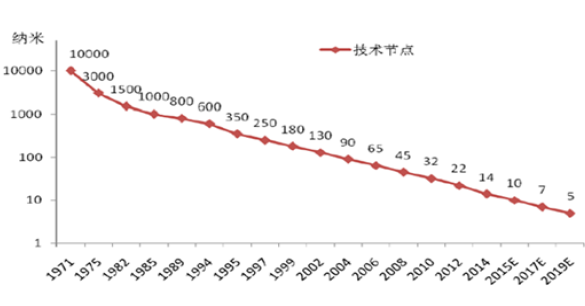 集成电路产业沿着摩尔定律发展,制程节点不断缩小,1971年集成电路的制程节点是10微米(百分之一毫米),发展到现在,三星和台积电量产10纳米(十万分之一毫米)即将实现量产,技术节点缩小到千分之一,意味着晶体管面积缩小百万分之一。集成电路制程发展历史