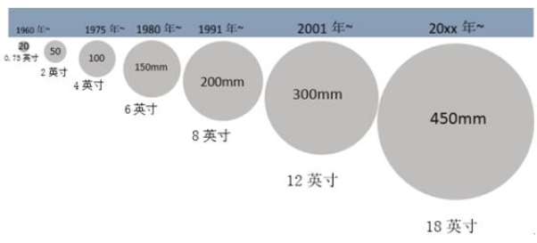 硅片尺寸越大,将来在制成的每块晶圆上就能切割出更多的芯片,单位芯片的成本也就更低。在1960年时期就有了0.75英寸(约20mm)左右的单晶硅片。在1965年左右Gordon Moore 提出摩尔定律时,还是以分立器件为主的晶体管,然后开始使用少量的1.25 英寸小硅片,进而集成电路用的1.5英寸硅片更是需求大增。之后,经过2英寸,3英寸,和4英寸。接下来5英寸,6英寸,8英寸,然后进入12英寸。业界较为公认的说法,1980年代是4英寸硅片占主流,1990年代是6英寸占主流,2000年代是8英寸占主流,到2002年时英特尔与IBM首先建12英寸生产线,到2005年已占20%,及2008年占30%,而那时8英寸已下降至54%及6英寸下降至11%。预计在2020年左右,18英寸(450mm)的硅片将开始投入使用。 半导体硅片尺寸发展历程