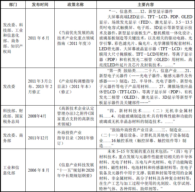 行业的主管部门为工业和信息化部,负责行业管理、产业政策制定及行业发展规划等,行业内的企业完全基于市场化方式自主生产经营。近年来,我国相继推出了一系列支持视窗防护屏行业发展的政策,具体如下表所示:
