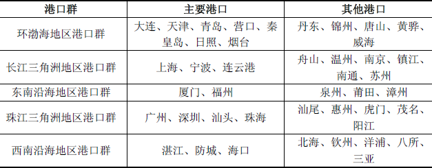 根据《中华人民共和国港口法》,港口建设应当符合港口规划。由交通部与国家发改委联合组织编制的《全国沿海港口布局规划》是指导我国沿海港口布局和发展的纲领性文件,其他港口规划均应当符合港口布局规划。根据不同地区的经济发展状况及特点、区域内港口现状及港口间运输关系和主要货类运输的经济合理性,《全国沿海港口布局规划》将全国沿海港口划分为环渤海、长江三角洲、东南沿海、珠江三角洲和西南沿海5 个港口群,强化群内综合性、大型港口的主体作用,形成煤炭、石油、铁矿石、集装箱、粮食、商品汽车、陆岛滚装和旅客运输等8 个运输系统的布局。我国五个港口群体的基本情况和布局如下: