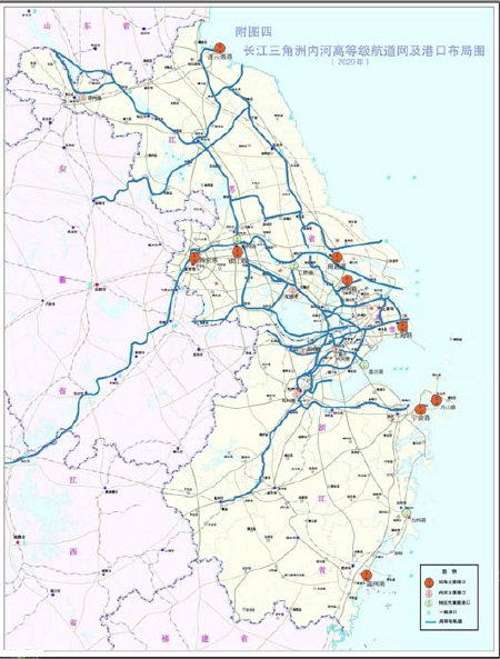 长江三角洲地区港口群依托上海国际航运中心,以上海、宁波、连云港为主,充分发挥舟山、温州、南京、镇江、南通、苏州等沿海和长江下游港口的作用,服务于长江三角洲以及长江沿线地区的经济社会发展,主要布局进口铁矿石、煤炭、石油、天然气、粮食接卸中转储运港,集装箱干线港,以及陆岛滚装、旅客中转和邮轮运输港。舟山港凭借区位及深水岸线资源优势,在长江三角洲地区港口物流系统中主要发挥进口石油、天然气接卸中转储运、进口铁矿石中转运输、粮食中转储运等方面的功能。长江三角洲内河高等级航道网及港口布局图