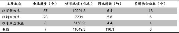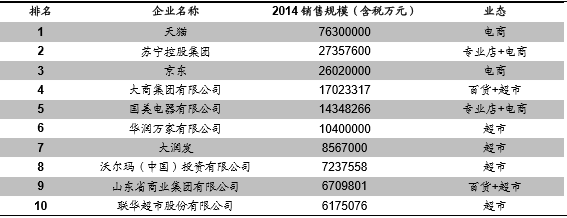 百货和超市是实体零售企业最主要业态。实体零售按业态形式可划分为百货店、超市、便利店、大型综合超市、仓储式会员式商店、专业店、专卖店和购物中心八种。据中国商业联合会与中华全国商业信息中心共同发布的《2014年度中国零售百强榜》,百货与超市的企业数量在零售百强中占比为85%。