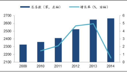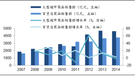 中国大型超市和百货店销售额及增长率(2007-2014)