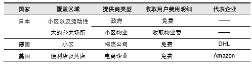 在国外,尤其是在德国、日本等国家,智能快递柜发展时间较长,市场目前已经较为成熟。在日本,快递柜主要由政府部门和小区物业提供,政府提供的快递柜主要集中在流动性比较大的公共场所,以公益为主,小区中的快递柜则通过每月向用户收取物业费来盈利,由于日本政府推广力度大,小区物业基本可以实现收支平衡,并且还能提高小区的服务质量。在德国,DHL旗下子公司packstation目前已经覆盖德国90%的人口,并且成为了一些新建小区的配套设施,其快递柜主要还是以收发快递为主,没有其他盈利模式。但由于体量巨大,公司运营收入足以抵消投入和维护成本。在美国,亚马逊的AmazonLocker则主要安置于24小时便利店和药店等位置,消费者在3日内可以进行取货,运营主要以收发快递为主,暂无其他商业模式。