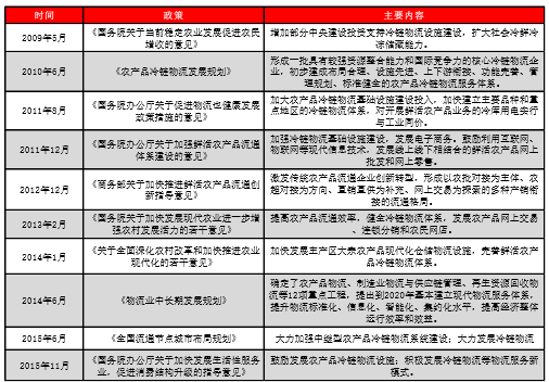 2016年1月发布的的中央一号文件明确提出,完善跨区域农产品冷链物流体系,开展冷链标准化示范,实施特色农产品产区预冷工程。
