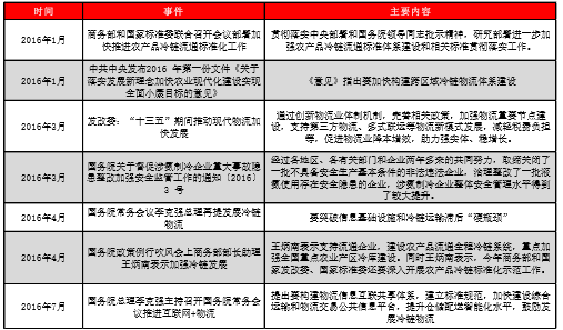今年以来,利好冷链物流政策、事件频出。2016中央一号文持续聚焦冷链物流,李克强总理在国务院常务会议多次提出加快建设运输物流平台、鼓励发展冷链物流,政策信号不断加强。