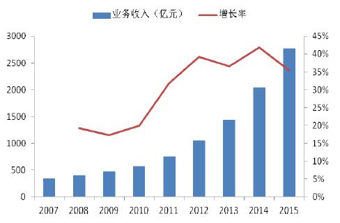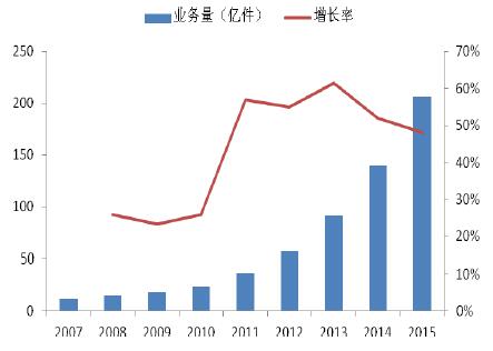电商的繁荣也促进了我国快递行业的发展,2008年我国快递行业收入刚刚突破400亿元,全年快递也仅有15.1亿件,而到2015年我国快递行业收入达到2770亿元,快递件数达到206.7亿件,行业收入复合增速达到27.4%,快递业务量复合增速达到45.32%。2008-2015年我国快递行业收入复合增速达27.4%