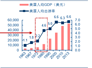 中国旅游产业现阶段发展可大致类比美国1972至1980年(中国2015年人均GDP近8000美元、人均出游次数2.91次,与美国1975年左右的水平接近),在此期间,美国人均GDP由5800美元提高至12000美元、居民出游次数由2.15次提高至4.56次,这一阶段也是美国低成本航空快速发展期。我们认为,来自经济增长、居民收入提高带动的大众旅游消费提升,有望驱动中国人均出游率水平在2020年之前实现翻倍。