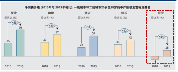 在休闲旅游不断增长的背景下,游客在旅游相关领域也呈现消费升级。按净消费升级(愿意增加支出的旅客占比与希望减少支出的旅客占比之差)测算,2013年休闲旅游市场中航空需求的净消费升级为16%,较2010年的-8%提升24%,即更多的休闲游客会选择乘坐飞机出行,且这一消费升级更多的表现在对航空公司的选择而非舱位升级上。