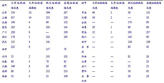 地铁建设热潮仍将持续。行业调查报告2015年统计显示,我国已有23个城市开通城市地铁运营线路,总运营里程达到2,658公里。据统计,2015年,我国地铁新增运营线里程297公里,比上一年增加12.6%。截至目前地铁在建的城市为35个,上报有地铁修建规划的39座城市中已有36座获批,其中规划地铁线路总规模4,248公里,在建线路总规模3,790公里。