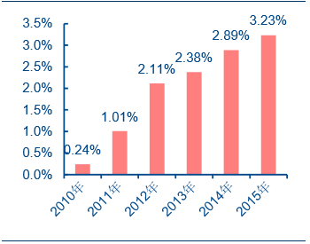 “双11”作为中国的电商重大促销日,随着消费者的认知加强以及各大商家更大投入,我们看到近几年其占全年网络零售交易额(B2C加C2C的网络购物交易额)的比重正不断提升。市场分析从2011年的占比1%,到2015年已经提升至3.2%,可见“双11”的效应正不断提升。