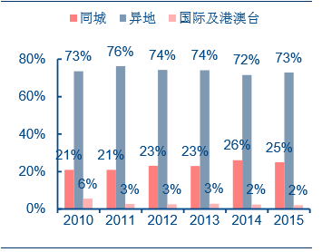 考虑提前备货,以及延长促销时间等因素后,中为认为用11月份整月快递量研究更加准确。研究报告通过数据分析,我们发现11月份占全年的快递量占比正从2010年的9.9%,不断提升至2015年的12.6%。从快递的类型结构变化上,不难发现国内的电商交易仍是主要支撑,跨境电商仍主要为辅助支撑作用;且异地件在“双11”中的占比较全年更高。