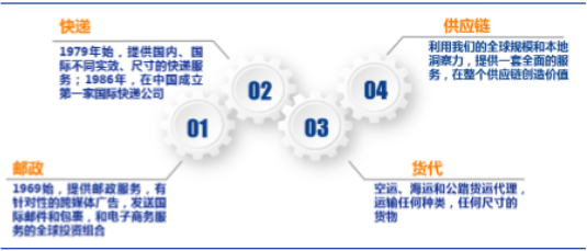 DHL主营业务包括四方面:邮政、快递、货代与供应链。具体业务方面,目前公司是德国国内最大的邮政服务商,国际市场上在空、海运代理、合同物流、快递服务业务方面市场份额居全球第一。根据DHL官方信息,中外运敦豪目前已居我国航空快递业的领导地位,市场占有率36%。