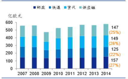 行业研究2015年DHL实现营业收入592.3亿欧元,同比增4.59%,净利润24.11亿欧元,同比减25.6%。各业务板块营业收入从高至低依次为邮政、供应链、货代和快递,但四者之间差距很小没几乎是将总收入一分为四,具体分别占总收入的27.1%,26.5%,23.9%,22.5%。利润的最大贡献者为快递板块,其余依次是邮政,供应链与货运板块,分别贡献了总利润的50.3%,39.9%,16.3%,-6.5%。快递板块以22.5%的营收贡献了超50%的净利,盈利能力最强。