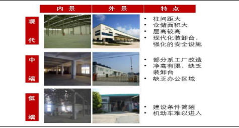 研究报告传统的低端仓储建设十分简陋,现代化的叉车很难进行仓储作业;中端仓储虽然对仓储结构进行了升级,但是净高有限;而现代仓储要求层高较高,拥有数量众多的门以供装卸和货物的即时转运。但是前面讲过,我国现代仓储的比例很小,大概占到仓储资源的20%左右,但是随对高端专业的物流设施的需求不断增强,加上现代物流地产对高端物流设施的定位,新兴的物流地产大有机会去弥补这方面的空白。